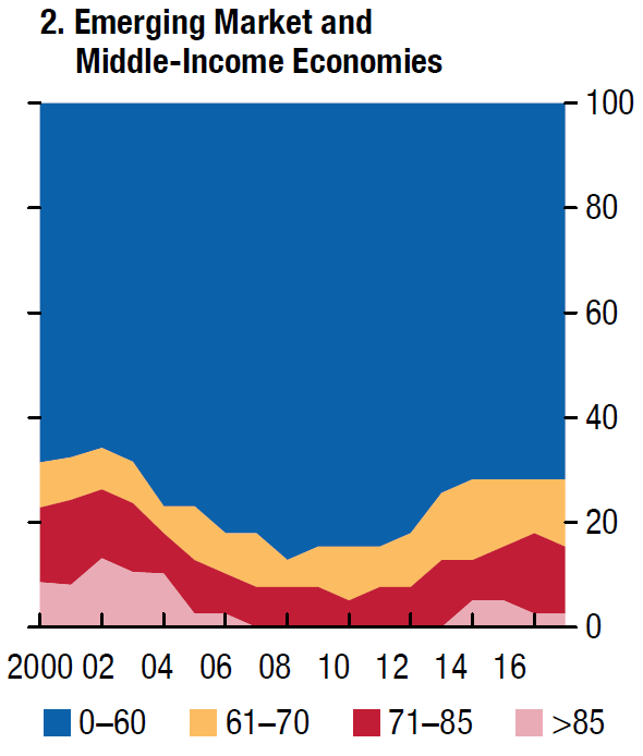 For advanced economies, debt-to-GDP ratios have plateaued since 2012 above 105 percent of GDP—levels not seen since World War II—and are expected to fall only marginally over the medium term. In emerging market and middle-income economies, debt-to-GDP ratios in 2017 reached almost 50 percent—a level seen only during the 1980s’ debt crisis—and are expected to continue on an upward trend.