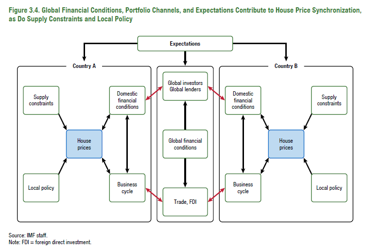 House prices may move in tandem across countries and major cities because of synchronous supply and demand factors. Supply‑side considerations include the costs of construction and land acquisition. On the demand side, demographics, tax and other policy considerations, and depreciation and maintenance play a role. Financial factors, such as the mortgage interest rate, the risk premium on assets with similar risk characteristics as housing, household leverage, and the expected nominal house price appreciation rate, also matter. Full Report